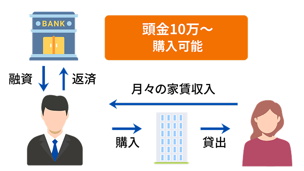 初期費用10万~スタート可能。物件購入費の多くは銀行から融資を受けて、家賃収入で返済をまかなう仕組みのため、最低月1万円からでも始められます。
