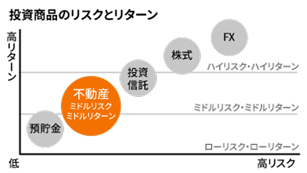株やFXのように日々の値動きに左右されず、家賃収入+資産価値の上昇でリターンを得ます。他の投資商品と比較してもミドルリスク・ミドルリターンといえるでしょう。
